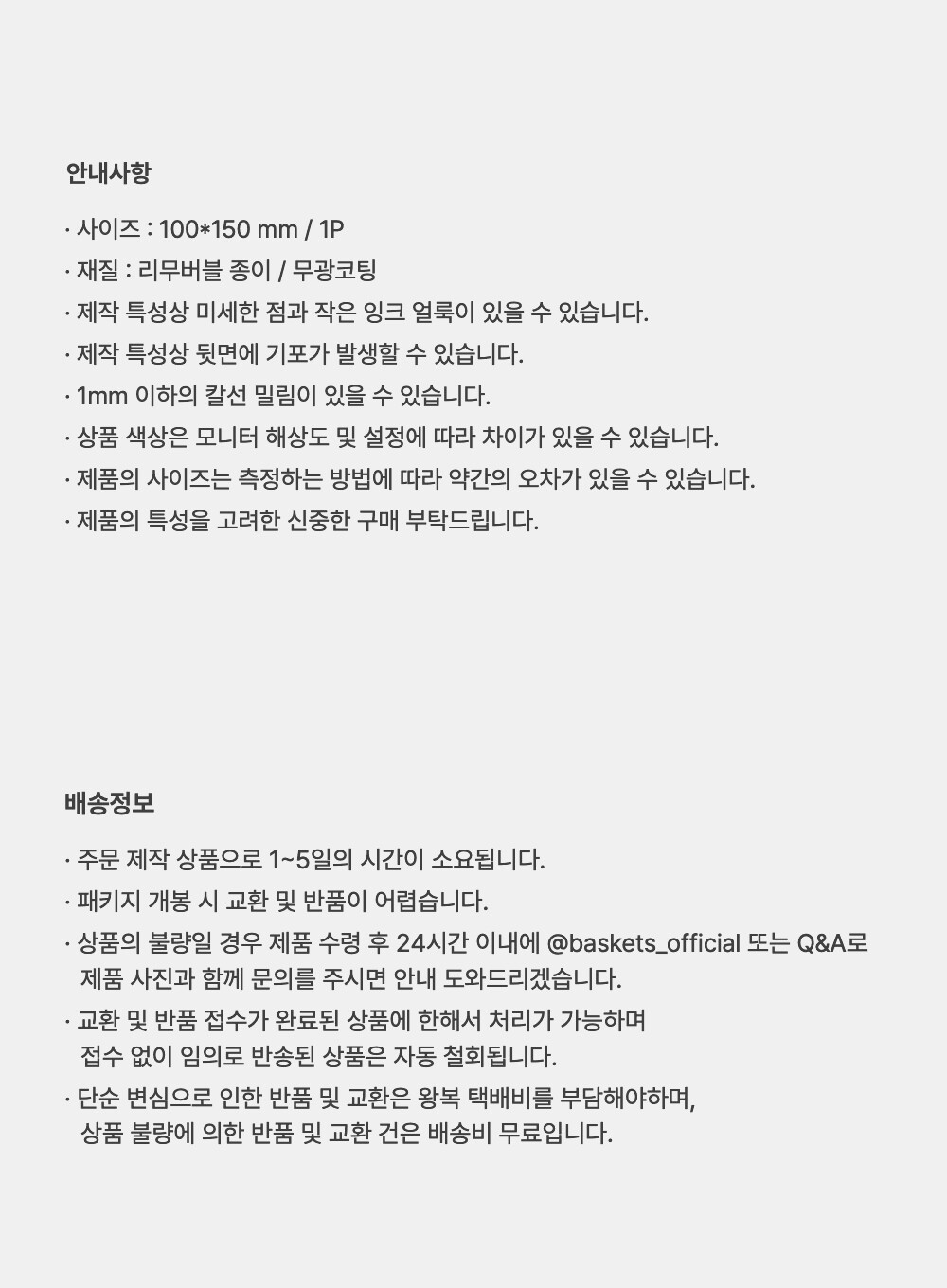- 상품 하자, 오배송의 경우 수령일로부터 7일 이내 고객센터 접수 후 교환∙반품이 가능합니다. (교환/반품비 무료)